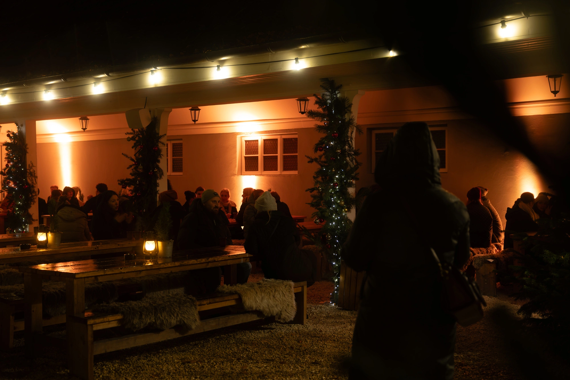 Wer seinen Glühwein lieber im Freien genießt, findet auf der Terrasse der Almhütte zusätzliche Sitzplätze mit Blick auf das winterliche Treiben.